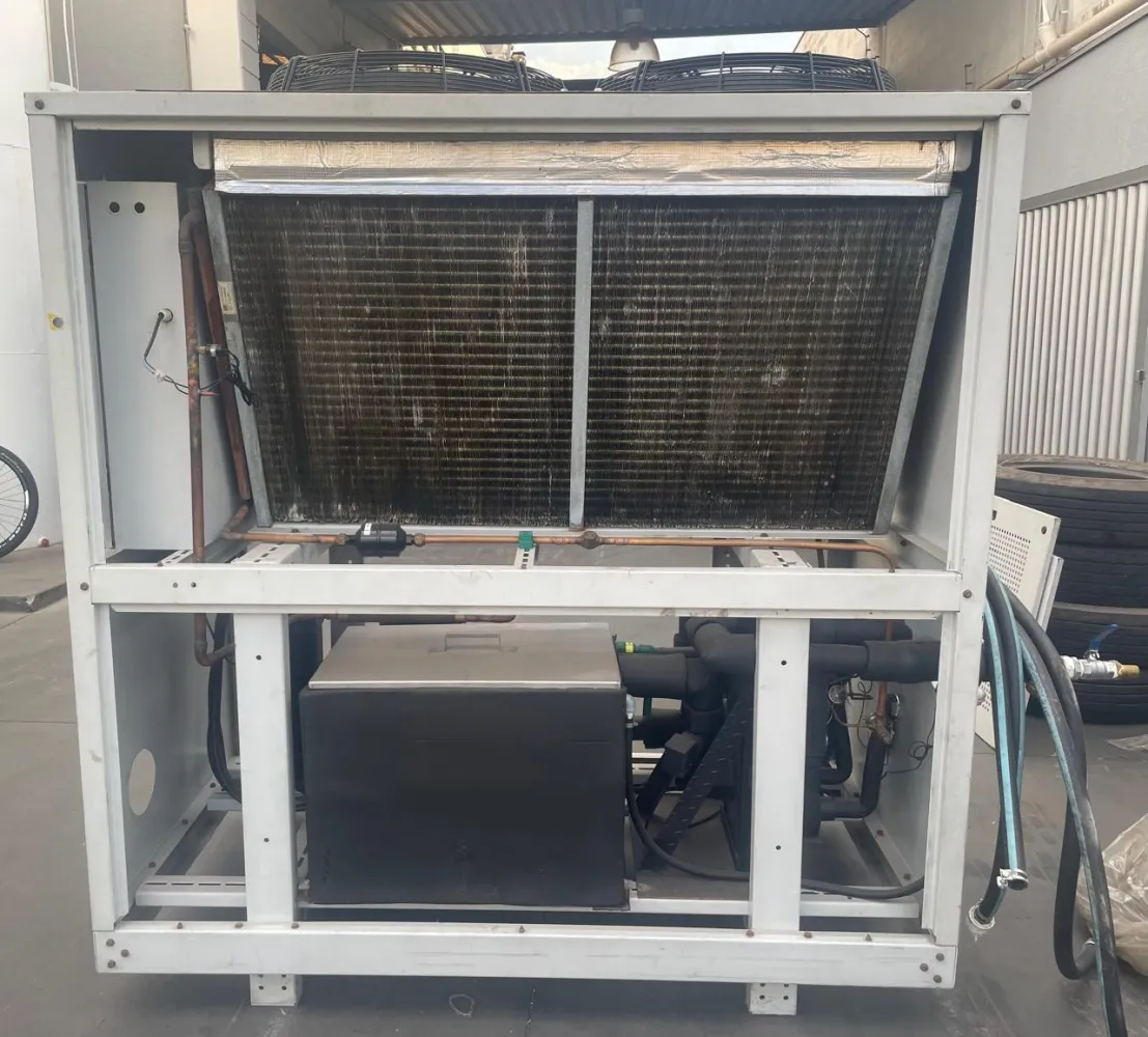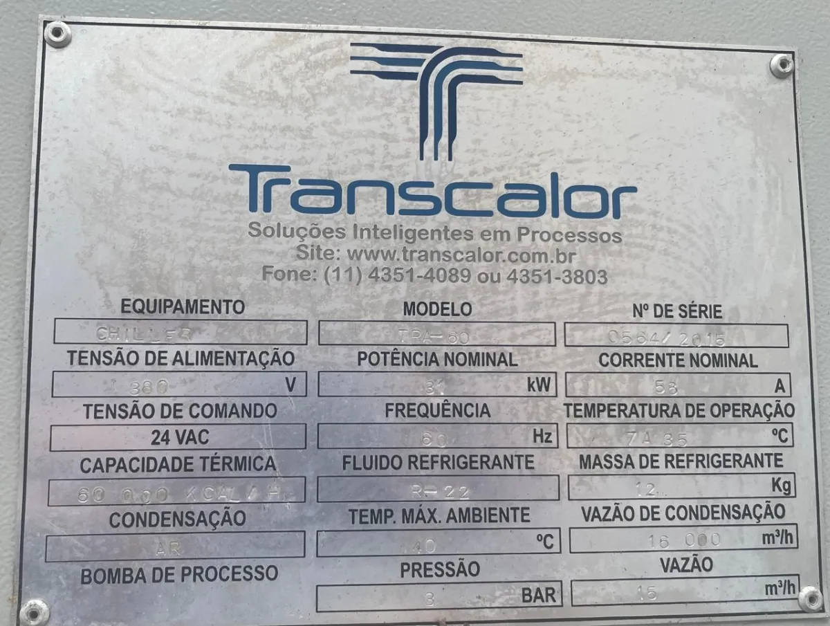 A unidade foi toda reformada e melhorada, contando com ventiladores maiores, reservatório em Inox, placa trocadora de calor demontável e compressores novos. Pronta para uso. Marca: Transcalor Modelo: TRA -060 Capacidade térmica: 60.000 kcal/h Tensão: 380V Potência Nominal: 31 kw Corrente Nominal: 58A Tensão de Comando: 24VAC Frequência : 60HZ Temperatura de Operação : 7 a 35Cº Capacidade Térmica : 60.000kcal/h Fluido Refrigerante : R22 Massa Refrigerante : 12kg Condensação : AR Temperatura Máxima Ambiente : 40Cº Vazão de Condensação : 16.000 m3/h Pressão : 3 Bar Vazão : 15 m3/h
